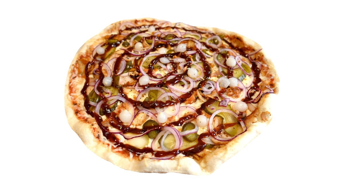 Fermentinis sūris, pomidorų padažas, česnakinis aliejus, vištiena, kepta šoninė, raudonas svogūnas, kornišonai agurkai, žalia paprika