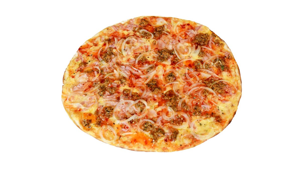 Pomidorų padažas, mocarela sūris, kumpis, saliamis, jautienos faršas, šoninės gabalėliai, svogūnas raudonas pjaustytas, barbekių padažas, česnakinis bazilikų aliejus