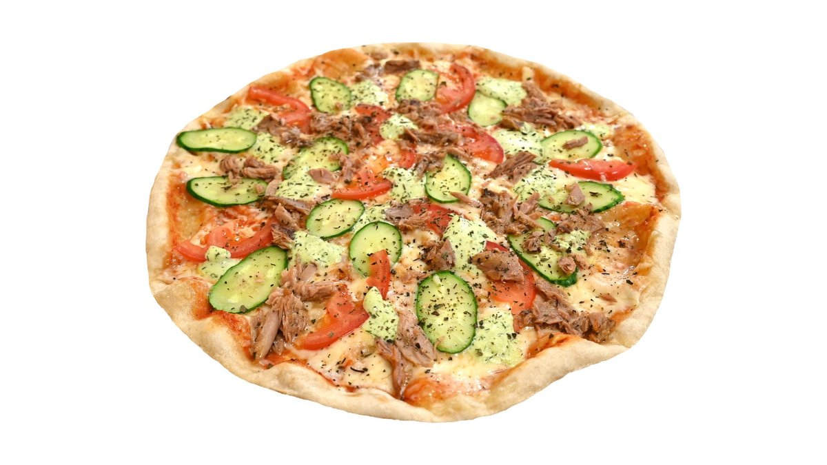 Fermentinis sūris, pomidorų padažas, česnakinis aliejus, tunas, švieži agurkai, pomidorai, žalia paprika