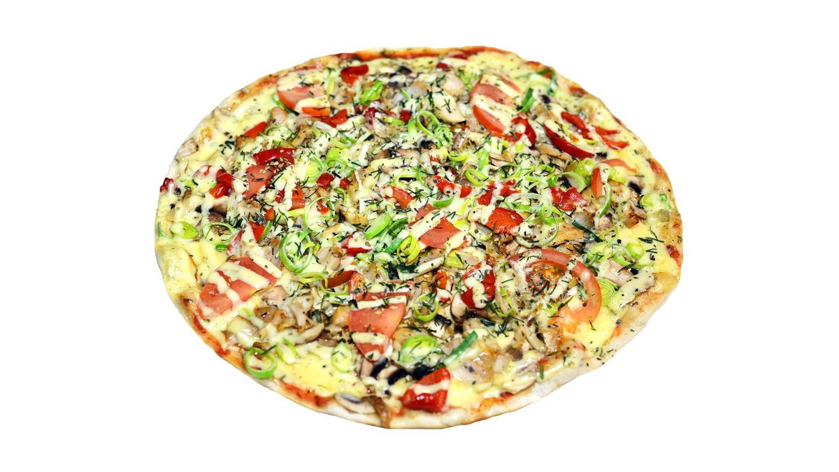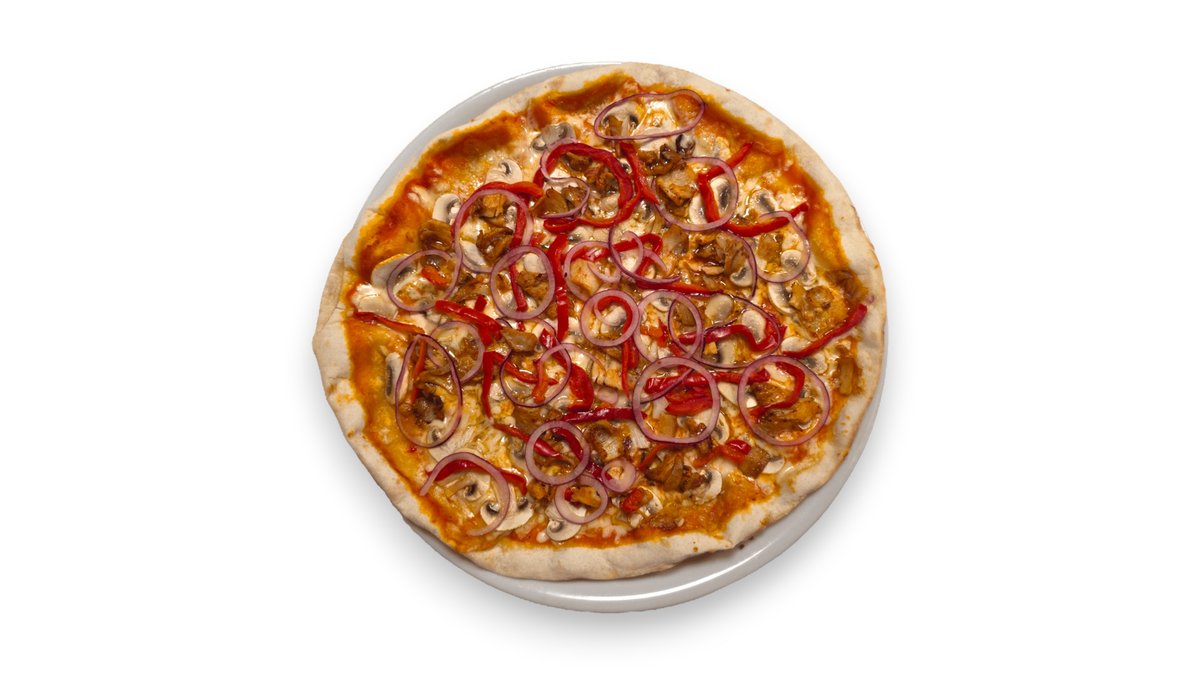 Pomidorų padažas, mocarela sūris, vištiena, pievagrybiai, marinuota paprika, raudonas svogūnas pjaustytas, česnakinis bazilikų aliejus.