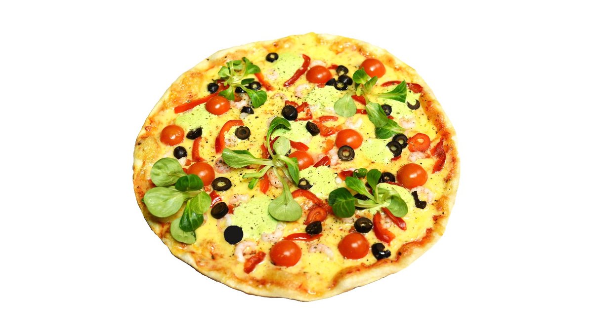 Fermentinis sūris, pomidorų padažas, česnakinis aliejus, krevetės, alyvuogės, konservuota paprika, vyšniniai pomidorai, pievagrybiai, sultenė, žaliasis padažas