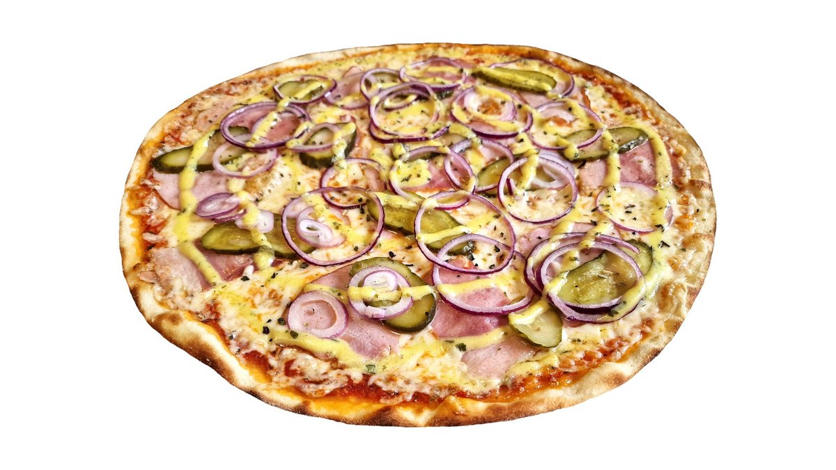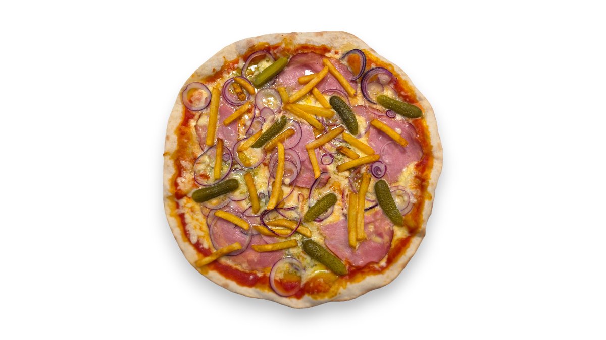 Pomidorų padažas, mocarela sūris, pjaustytas kumpis, svogūnas raudonas pjaustytas, marinuotas agurkas, bulvytės fri, plaktas kiaušinis, česnakinis bazilikų aliejus