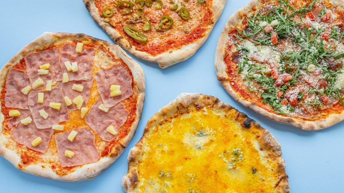 Pomidorų padažas, mocarela sūris, kepta vištiena, šoninė, pievagrybiai, traškūs svogūnai, "bernaise" padažas, česnakinis bazilikų aliejus.