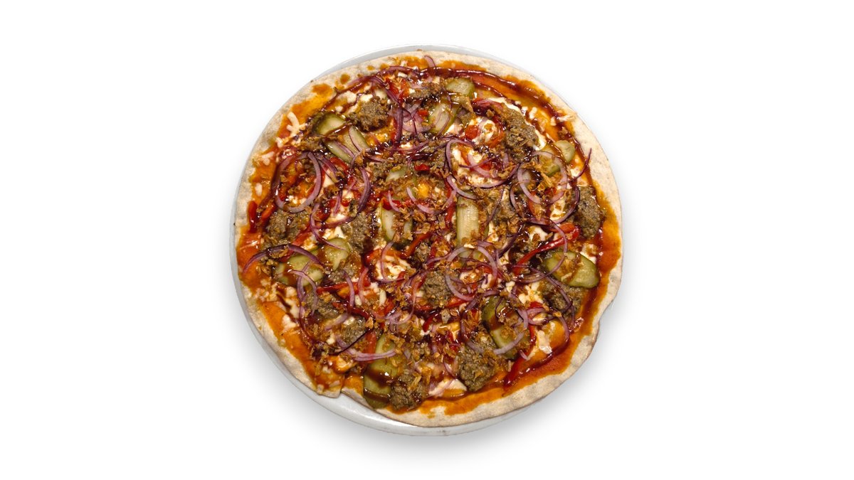 Pomidorų padažas, mocarela sūris, jautienos faršas, marinuoti agurkai, konservuota paprika, raudonas svogūnas pjaustytas, traškūs svogūnai, barbekių padažas, česnakinis bazilikų aliejus