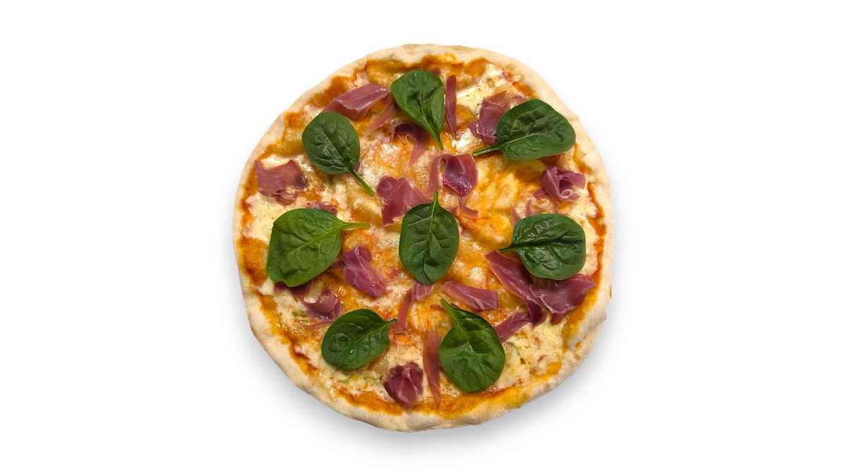 Pomidorų padažas, mocarela sūris, serrano kumpis, rukola, česnakinis bazilikų aliejus