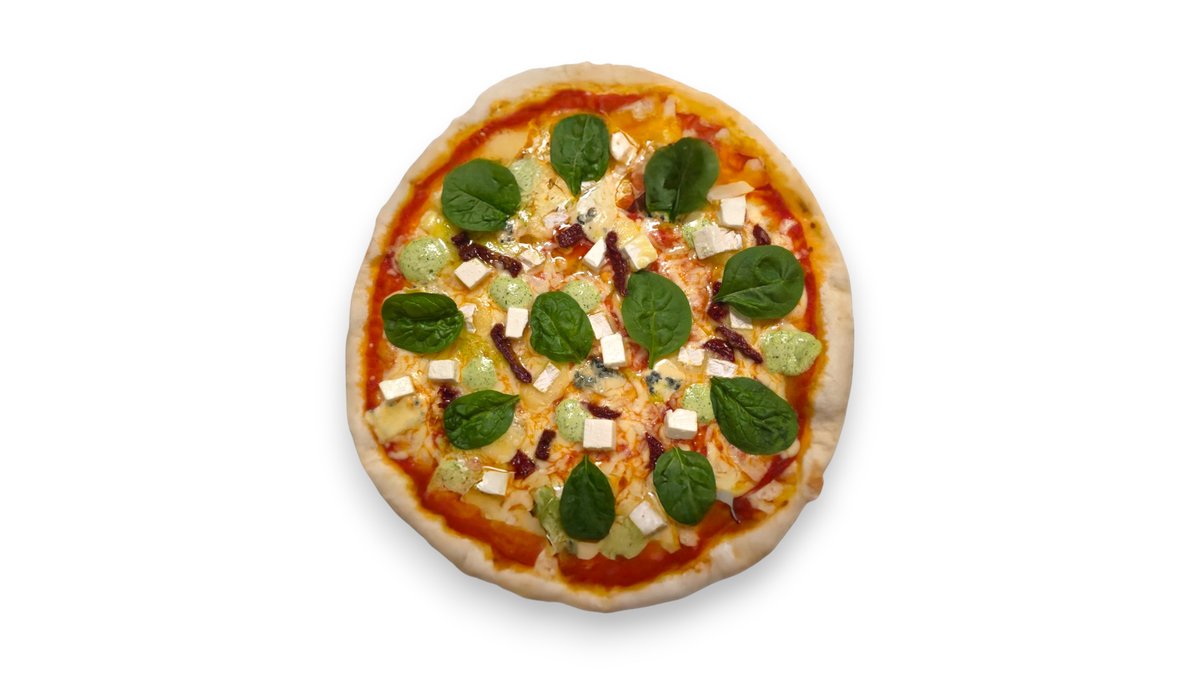 Pomidorų padažas, mocarela sūris, saulėje džiovinti pomidorai, feta, cukinija, špinatai, česnakinis bazilikų aliejus