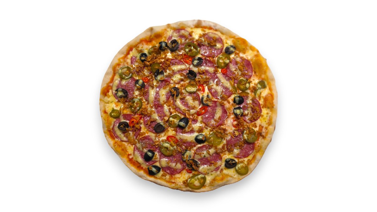 Pomidorų padažas, mocarela sūris, saliami dešra, alyvuogės, konservuoti jalapenai, čili pipirai, traškūs svogūnai, česnakinis bazilikų aliejus.