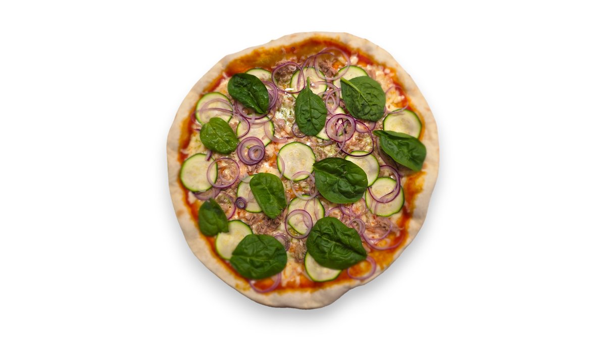 Pomidorų padažas, mocarela sūris, konservuotas tunas, svogūnas mėlynas pjaustytas, cukinija, špinatų lapai, česnakinis bazilikų aliejus.