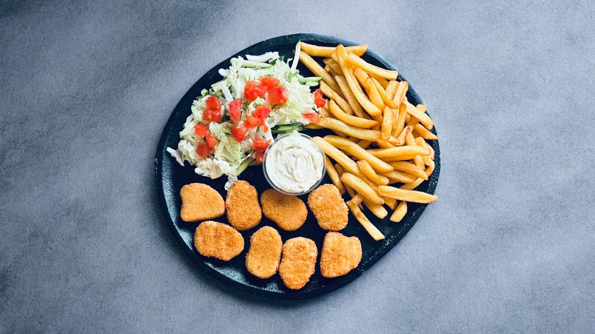 Vištienos nuggets, bulvytės fri, salotos, pomidorai, agurkai, padažas