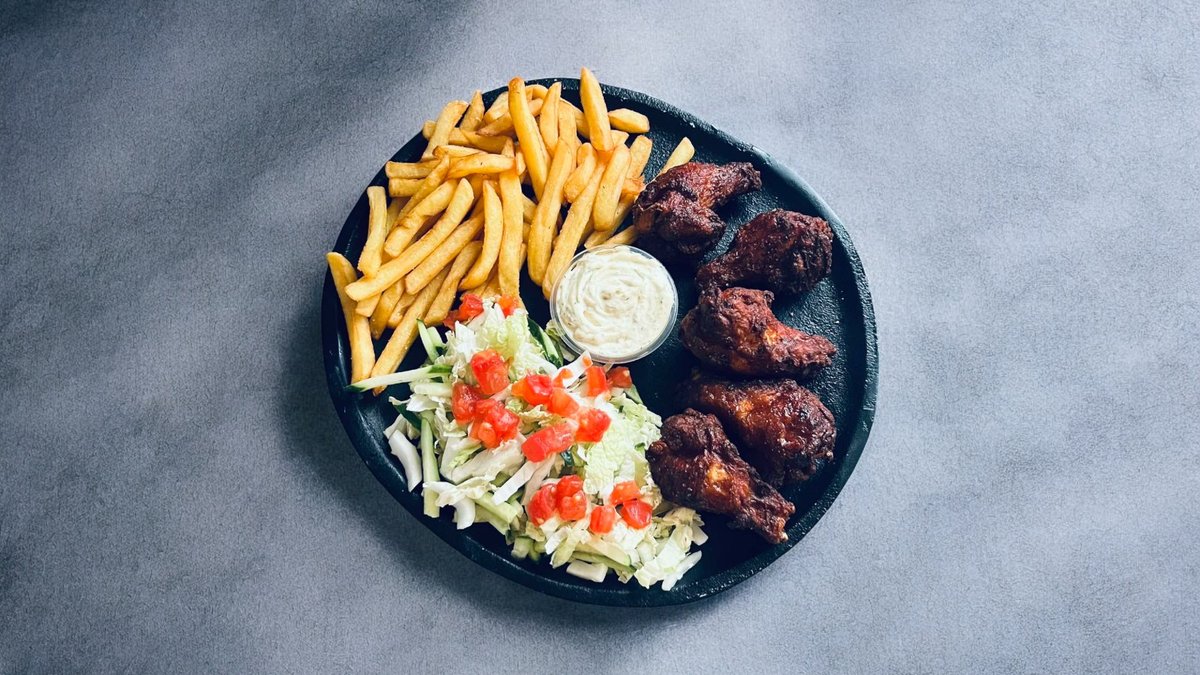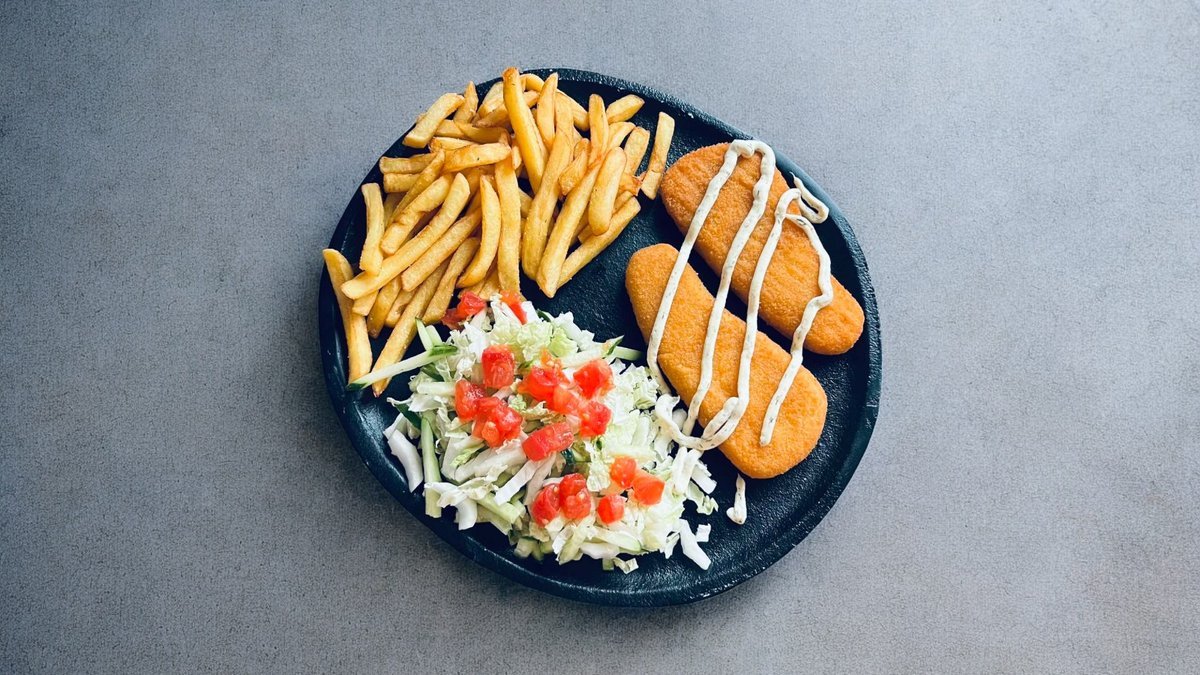 Fri bulvytės, vištienos peteliai, pekinas, agurkai, pomidorai, svogūnai, padažas