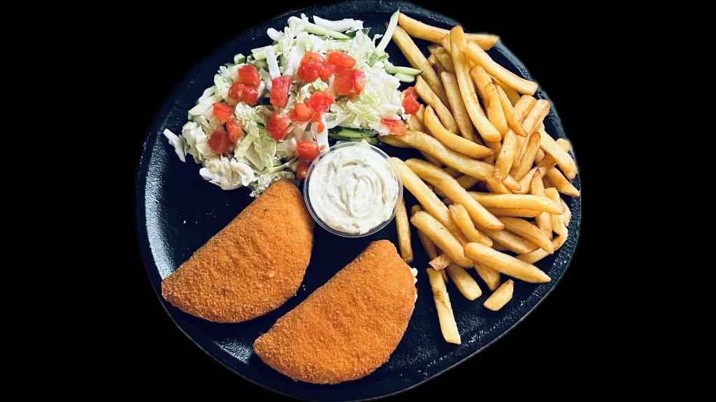 Vištienos filė kepsneliai viduje su sūriu ir kumpiu, salotos, agurkas, pomidoras, bulvytės fri, padažas