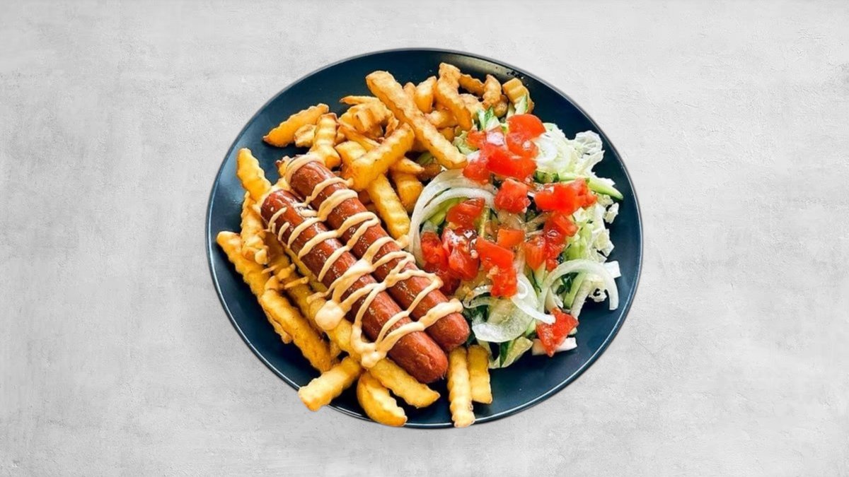 Fri bulvytės, dešrelės, pekinas, agurkai, pomidorai, svogūnai, padažas