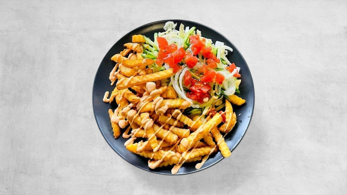 Fri bulvytės, pekinas, agurkai, pomidorai, svogūnai, padažas