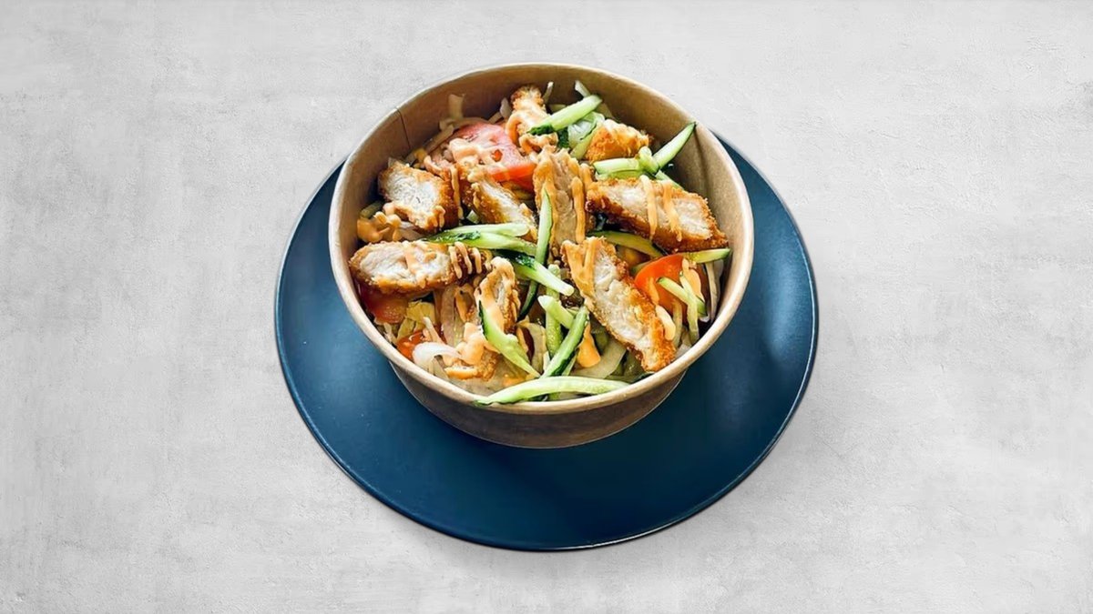 "Salotos su traškia vištiena: šviežias Kininis kopūstas, agurkai, pomidorai, svogūnai, gardžiai apkeptos vištienos gabaliukai ir pikantiškas padažas.