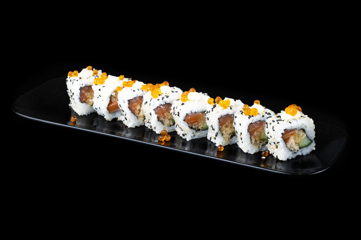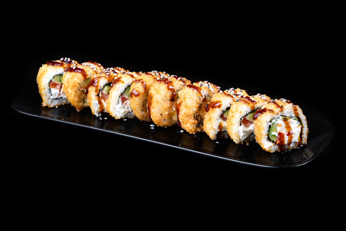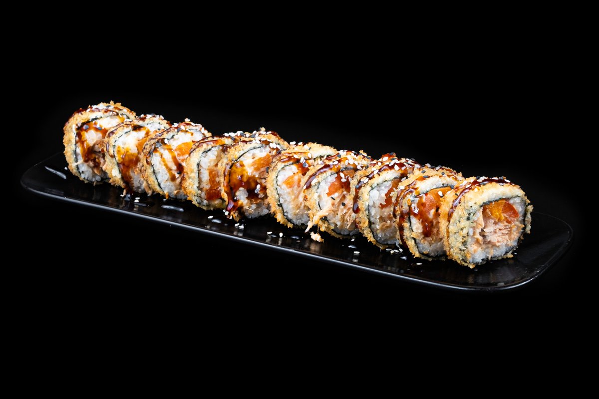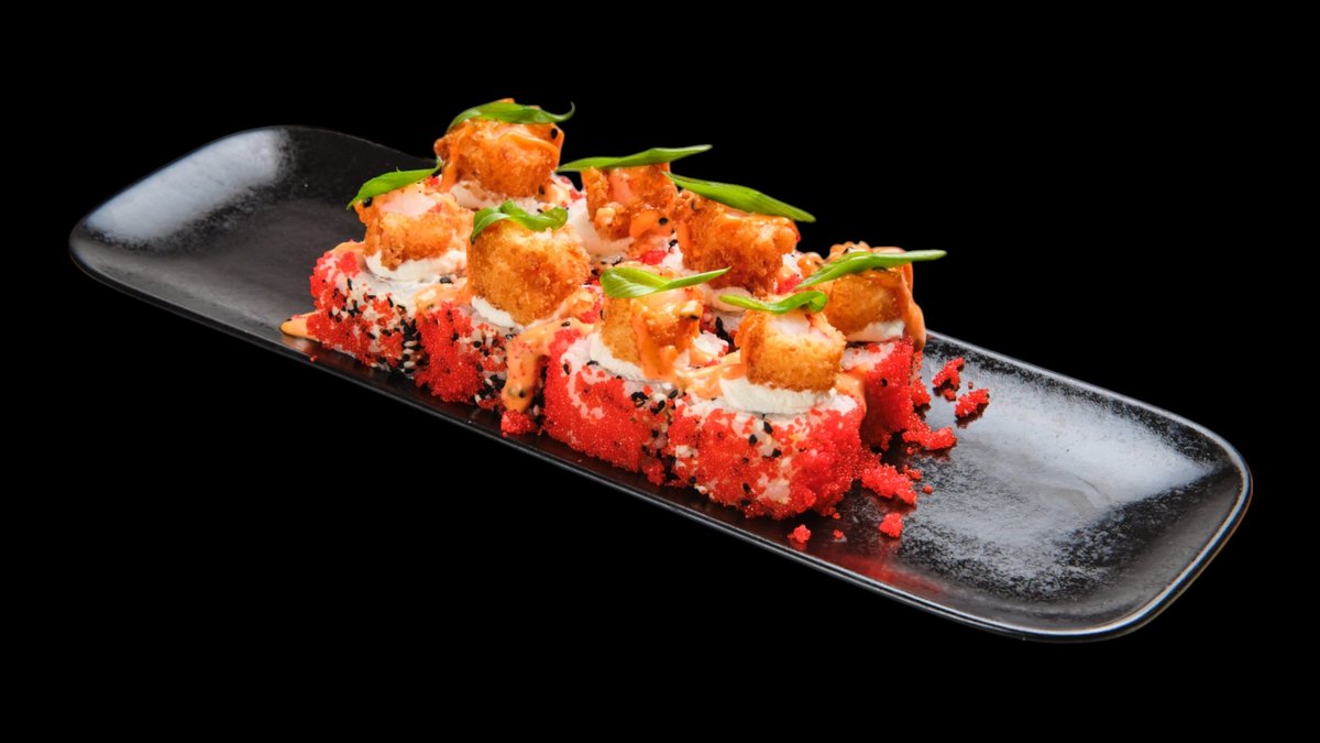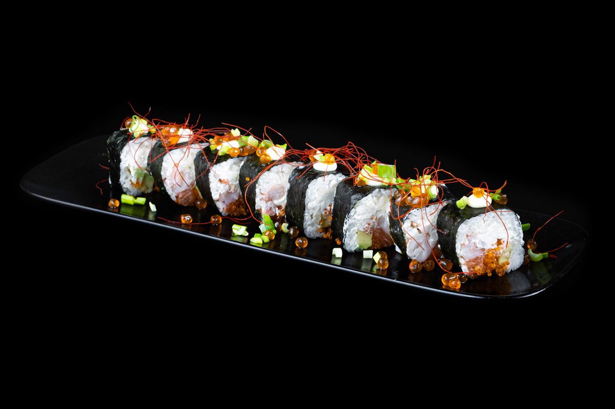 Keptos krevetės tempuroje, avokadas, tepamas sūris, massago ikrai, krabų lazdelės, tempura traškutis, tobiko ikrai, majonezas, kario padažas.