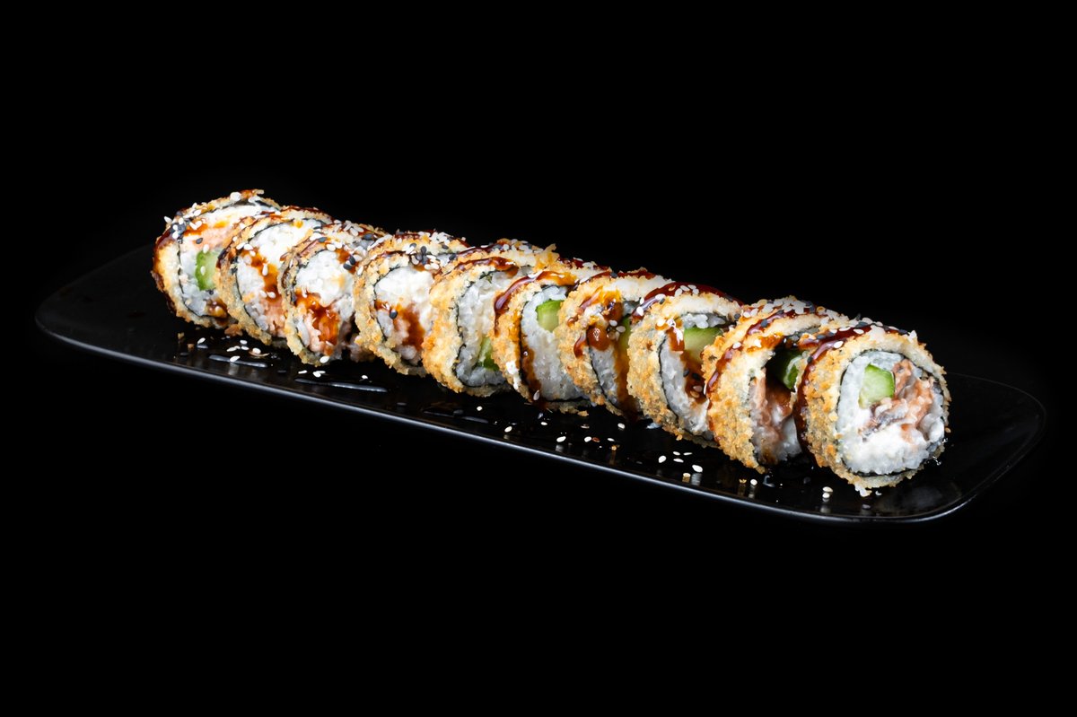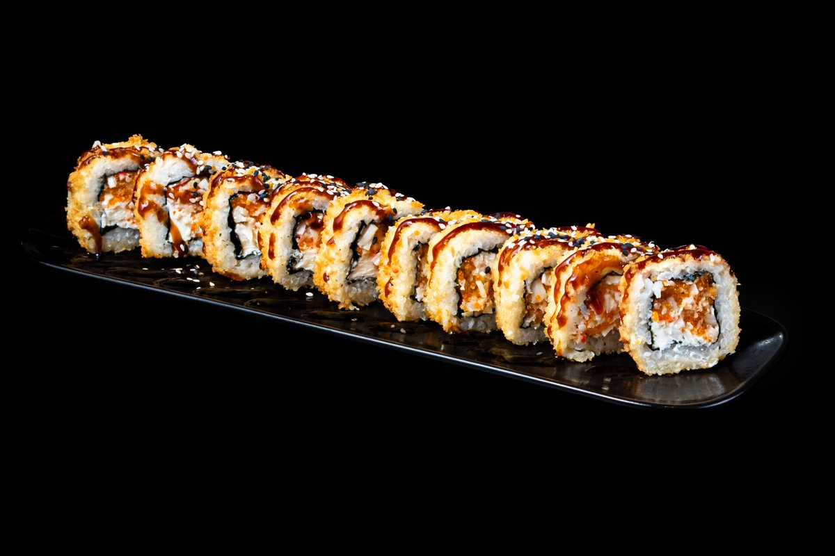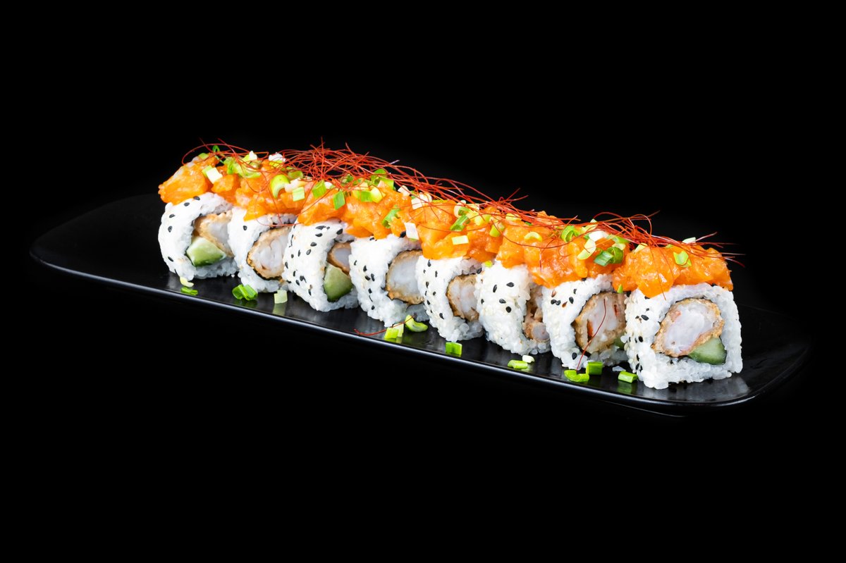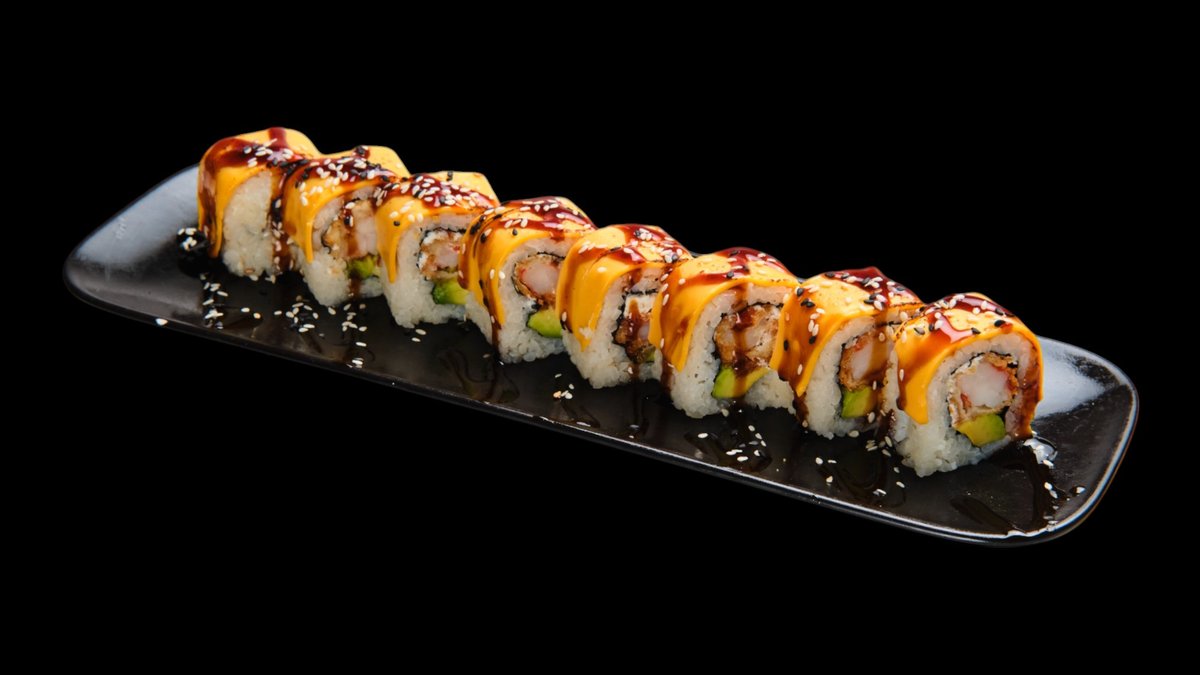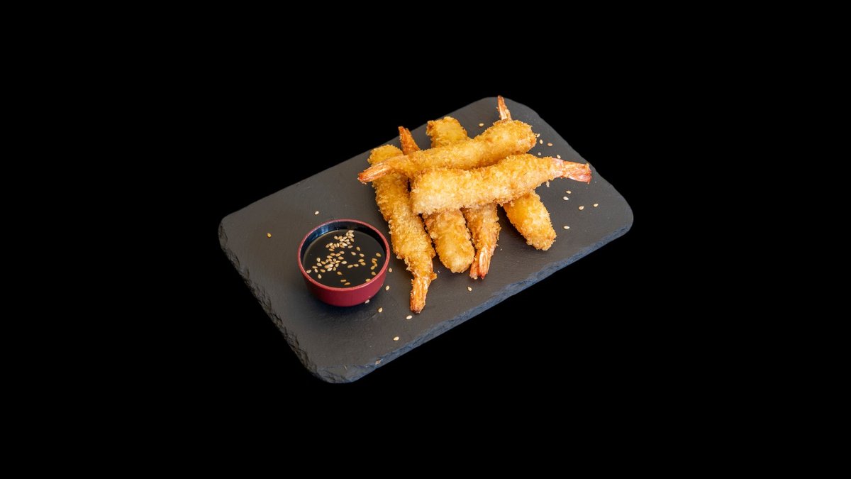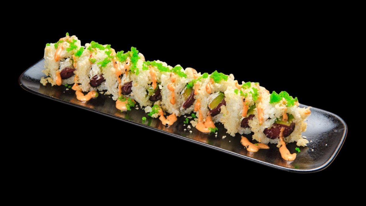 Keptos krevetės tempuroje, avokadas, tepamas sūris, massago ikrai, krabų lazdelės, tempura traškutis, tobiko ikrai, majonezas, kario padažas.