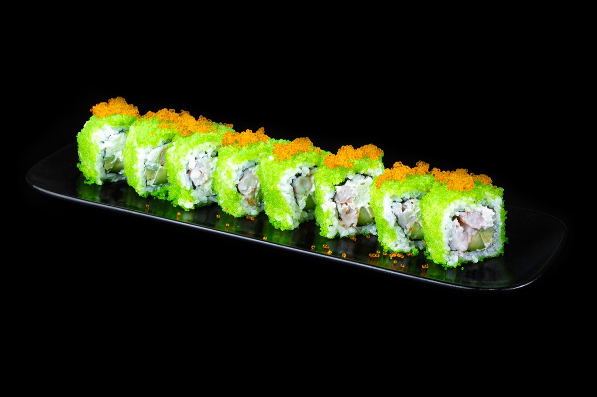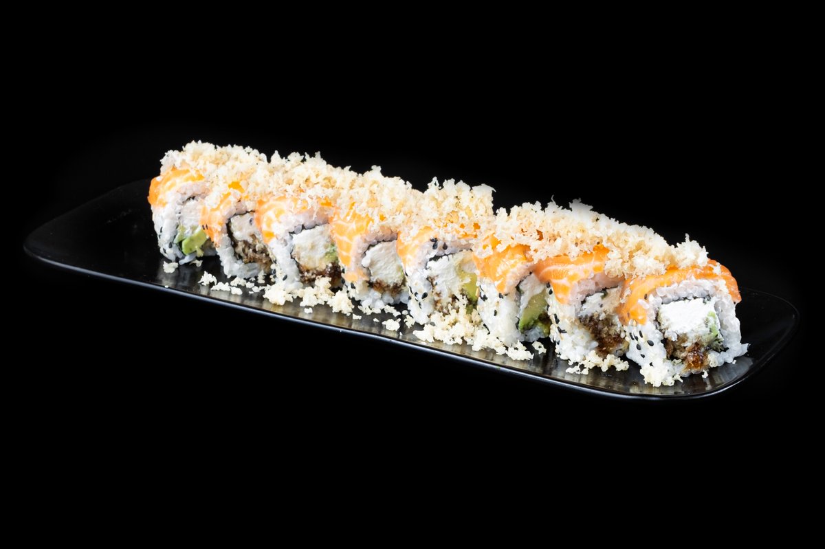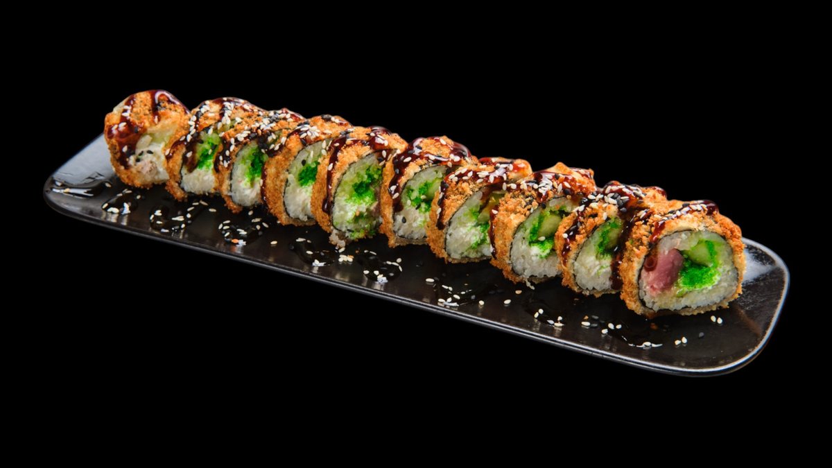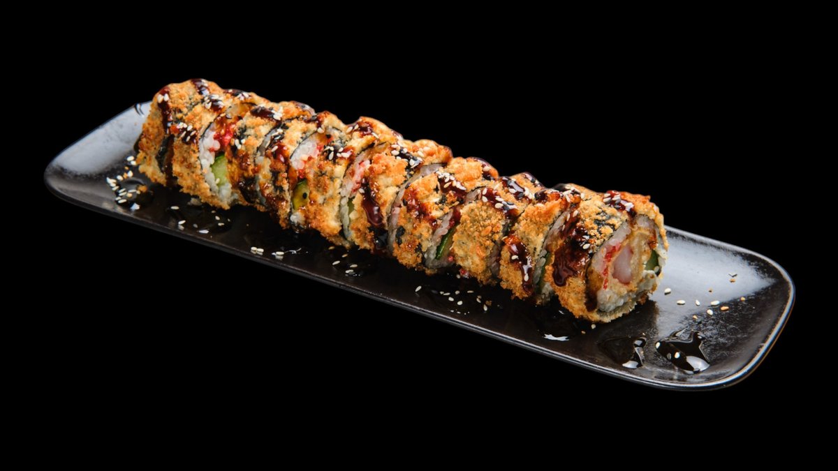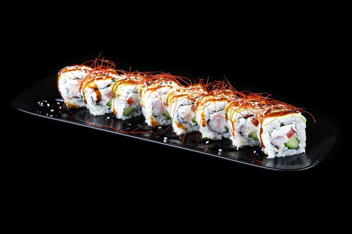 Keptos krevetės tempuroje, avokadas, tepamas sūris, massago ikrai, krabų lazdelės, tempura traškutis, tobiko ikrai, majonezas, kario padažas.