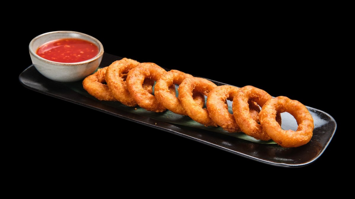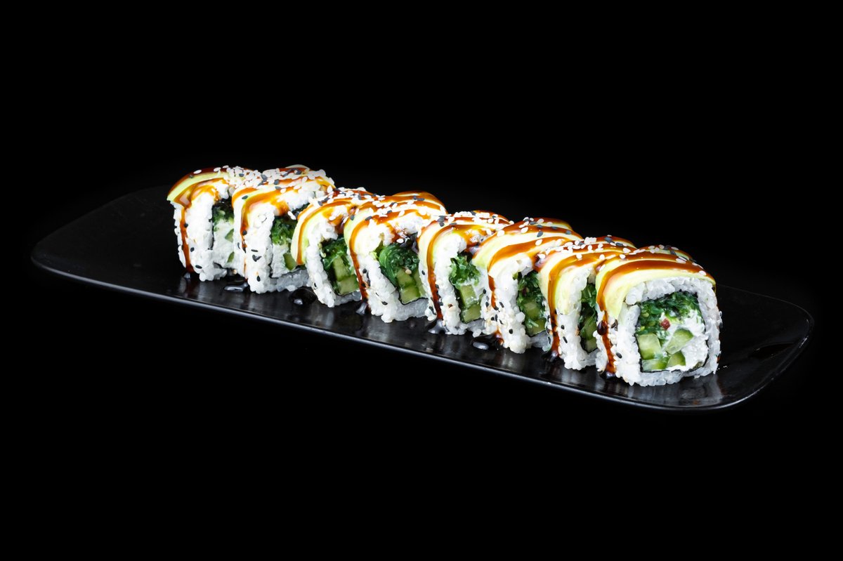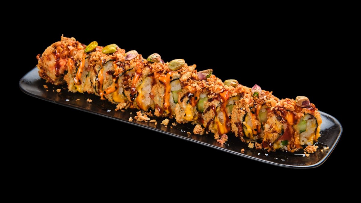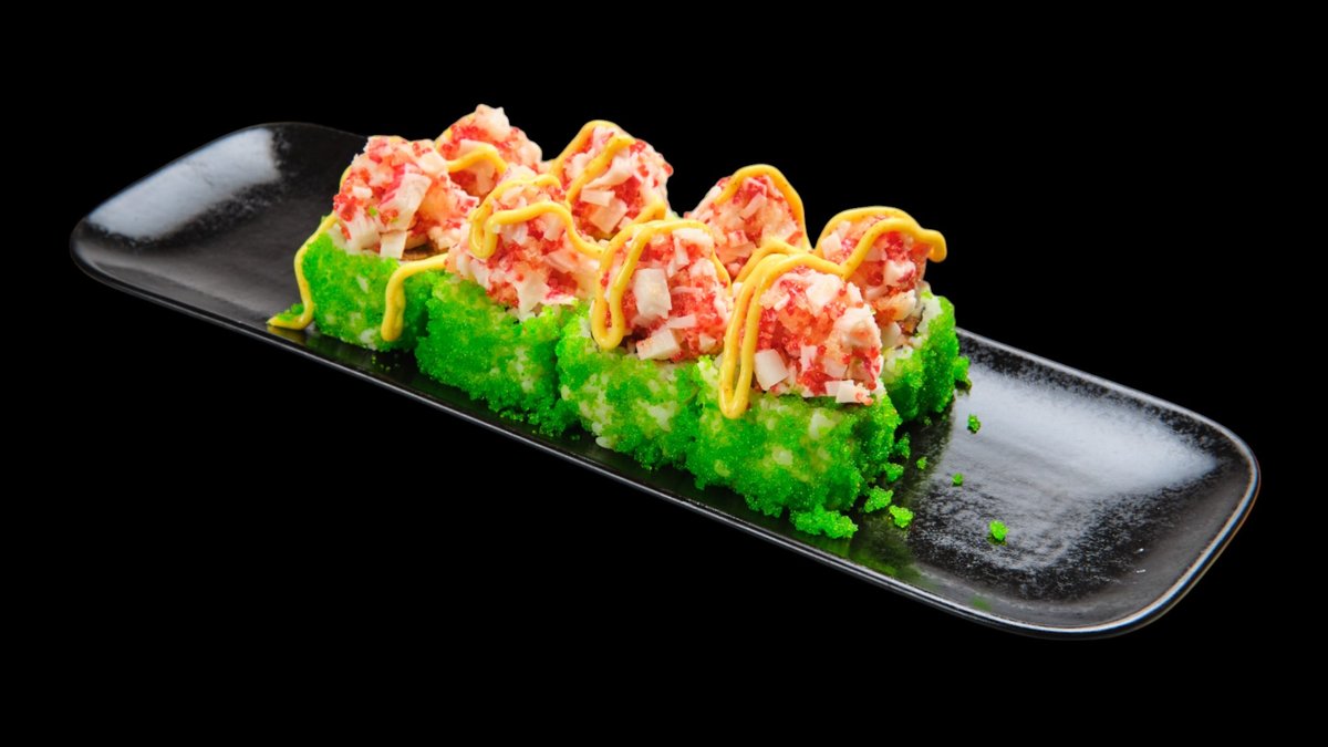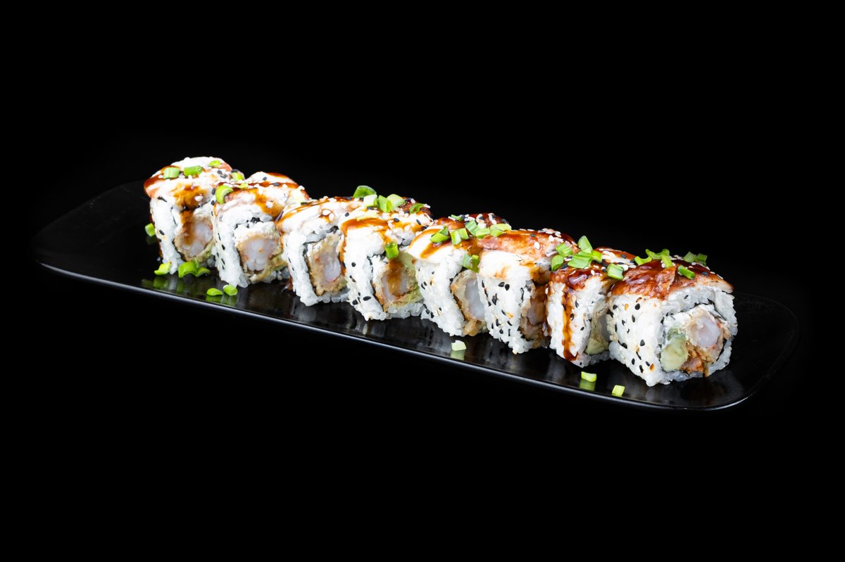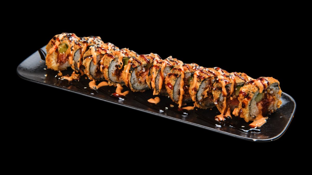 Keptos krevetės tempuroje, avokadas, tepamas sūris, massago ikrai, krabų lazdelės, tempura traškutis, tobiko ikrai, majonezas, kario padažas.
