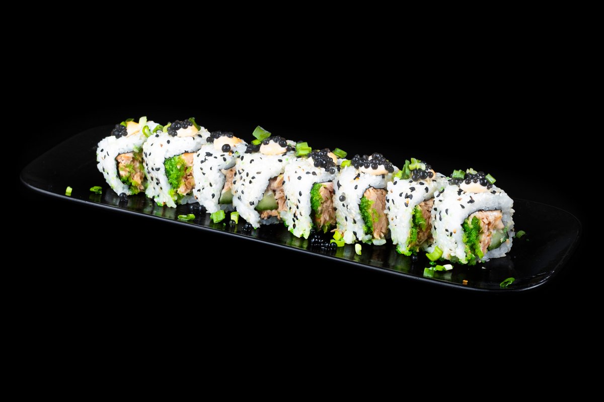 Tunas, tepamas sūris, avokadas, tempura, karai padažas, massago ikrai.