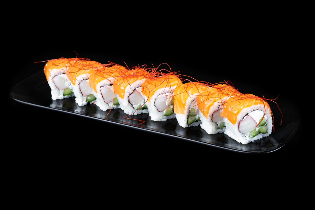 Philadelphia sūris, surimi krabų lazdelė, tempura traškutis, tobiko ikrai, majonezas, teryaki, sezamas