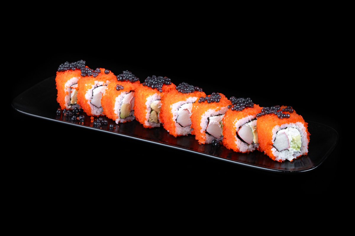 Surimi krabų lazdelė, avokadas, philadelphia sūris, massago ir megėju ikrai
