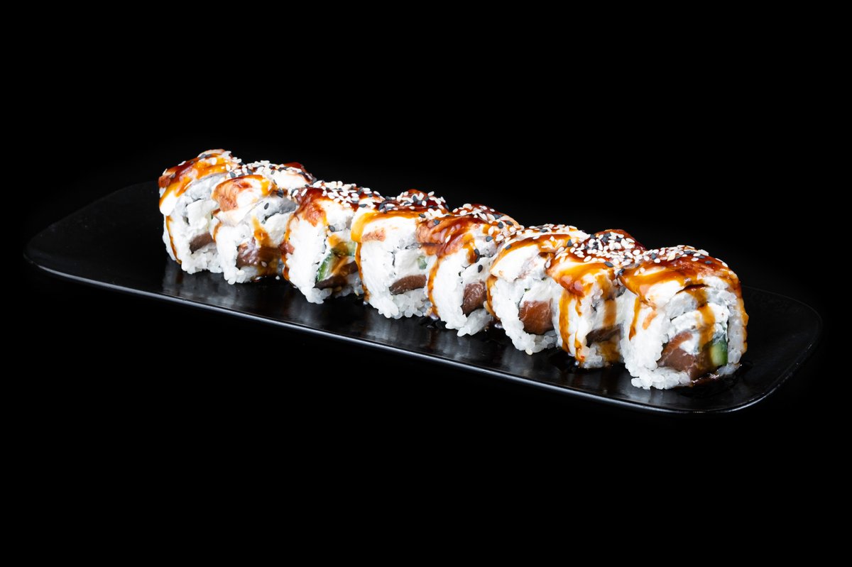 Lašiša, tempura, avokadas, philadelphia sūris, teryaki, sezamas
