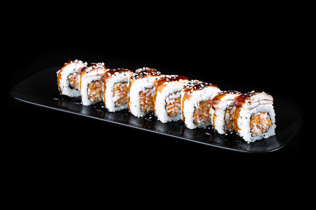 Ungurys, surimi krabų lazdelė, tempura, tobiko ikrai, majonezas, teryaki, sezamas