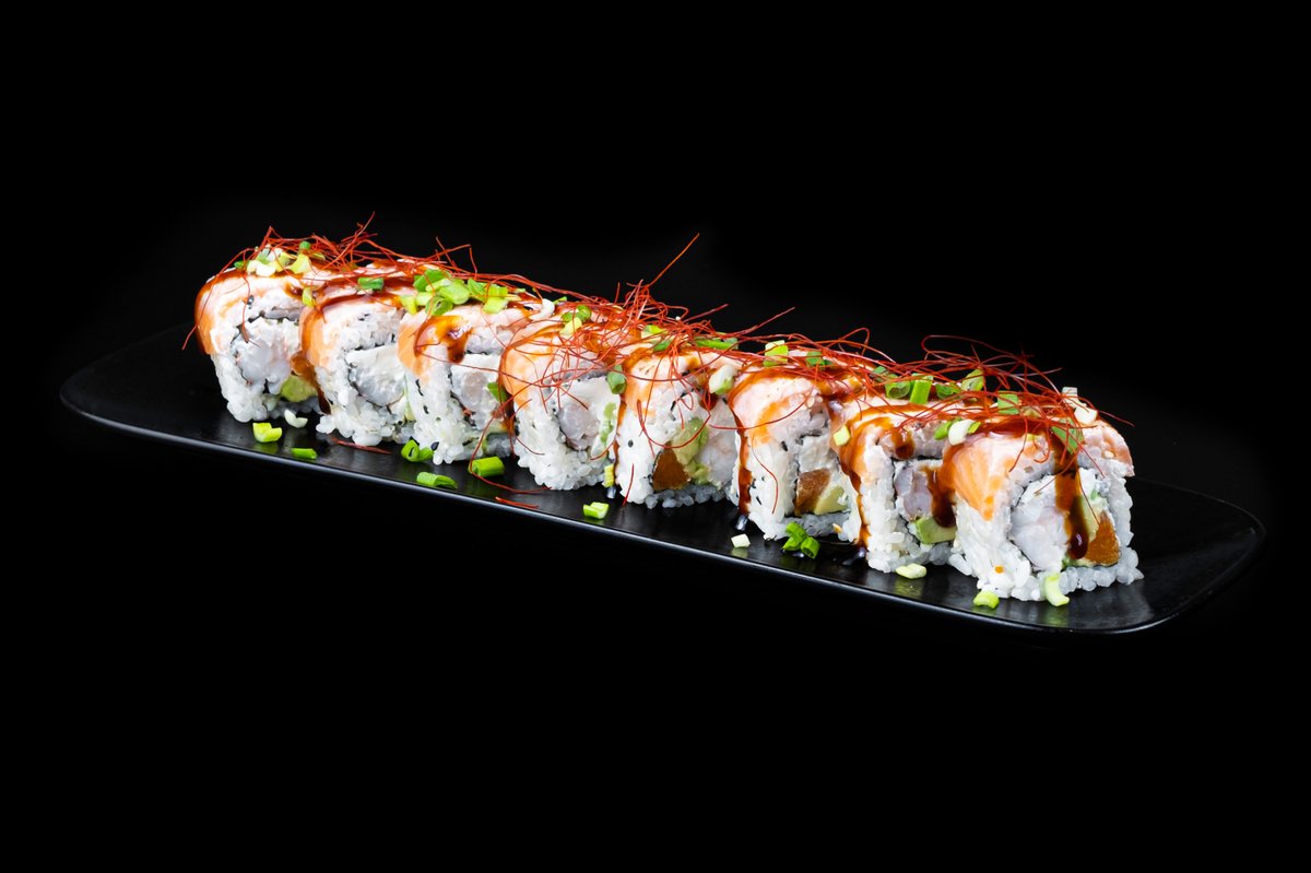 Virta krevetė, lašiša, avokadas, tobiko ikrai, svog. laiškai, majonezas, philadelphia sūris