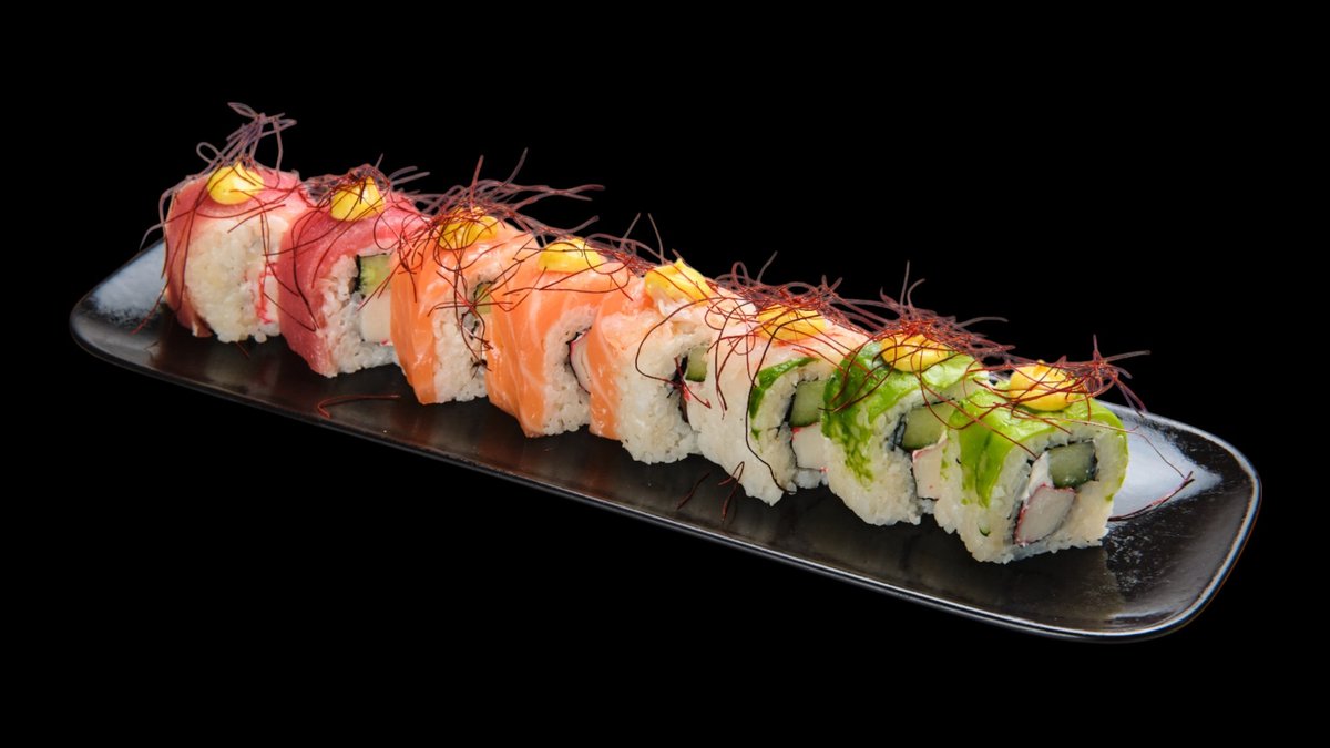 Lašiša, krevetė, tunas, avokadas, krabų lazdelės, tepamas sūris, agurkas, kario padažas