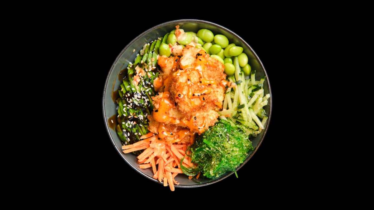 Ryžiai, teryaki padažas, sezamas, keptos krevetės tempuroje, agurkas, avokadas, morkos, wakame, edamame pupelės, karai padažas