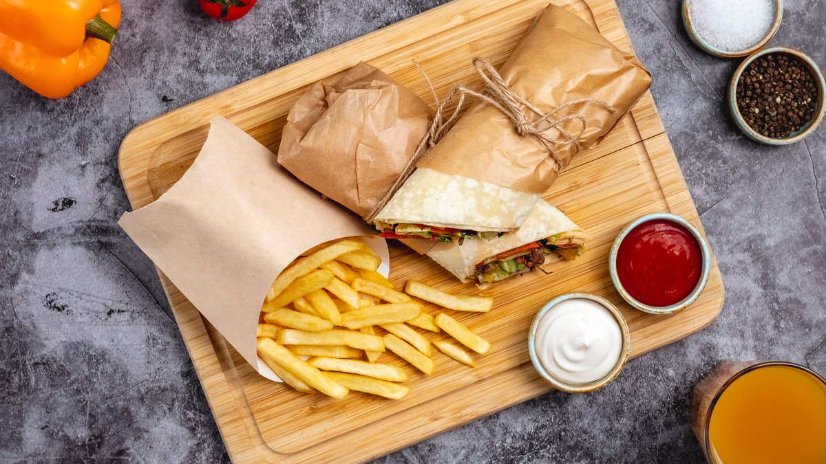 Vištienos kebabo mėsa lavaše su STIX, pomidoru, raudonu svogūnu, agurku. Porcija skudintų bulvyčių ir pasirinktas padažas, bei gėrimas.