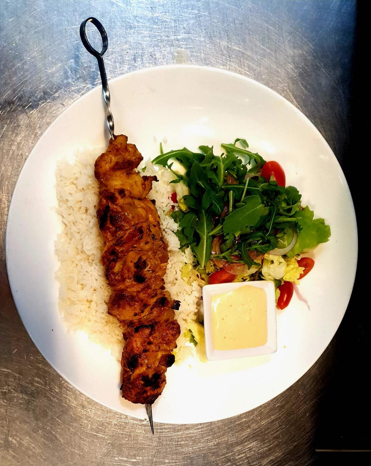 Sprandinės šašlykas su ryžiais bei šviežiomis daržovėmis