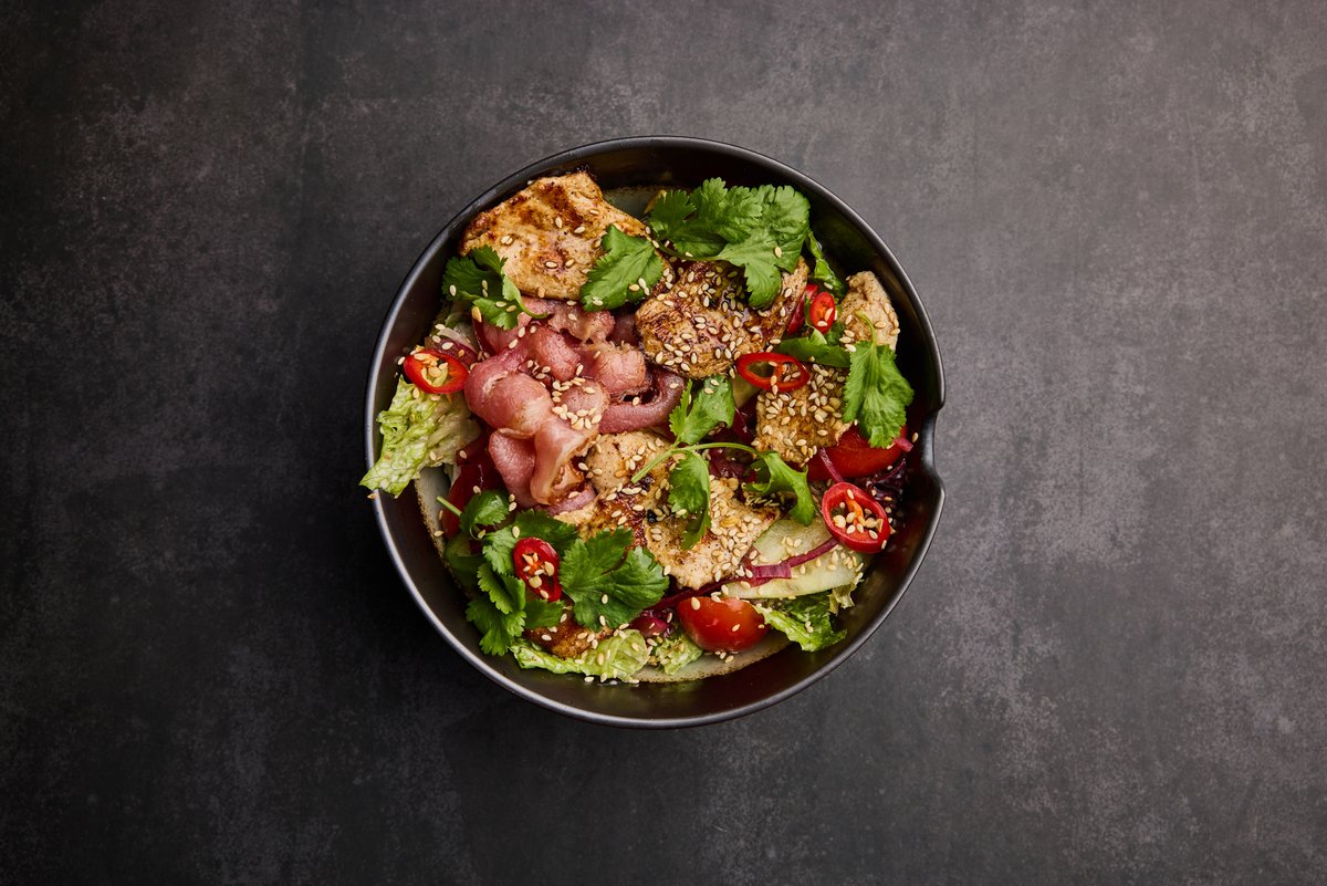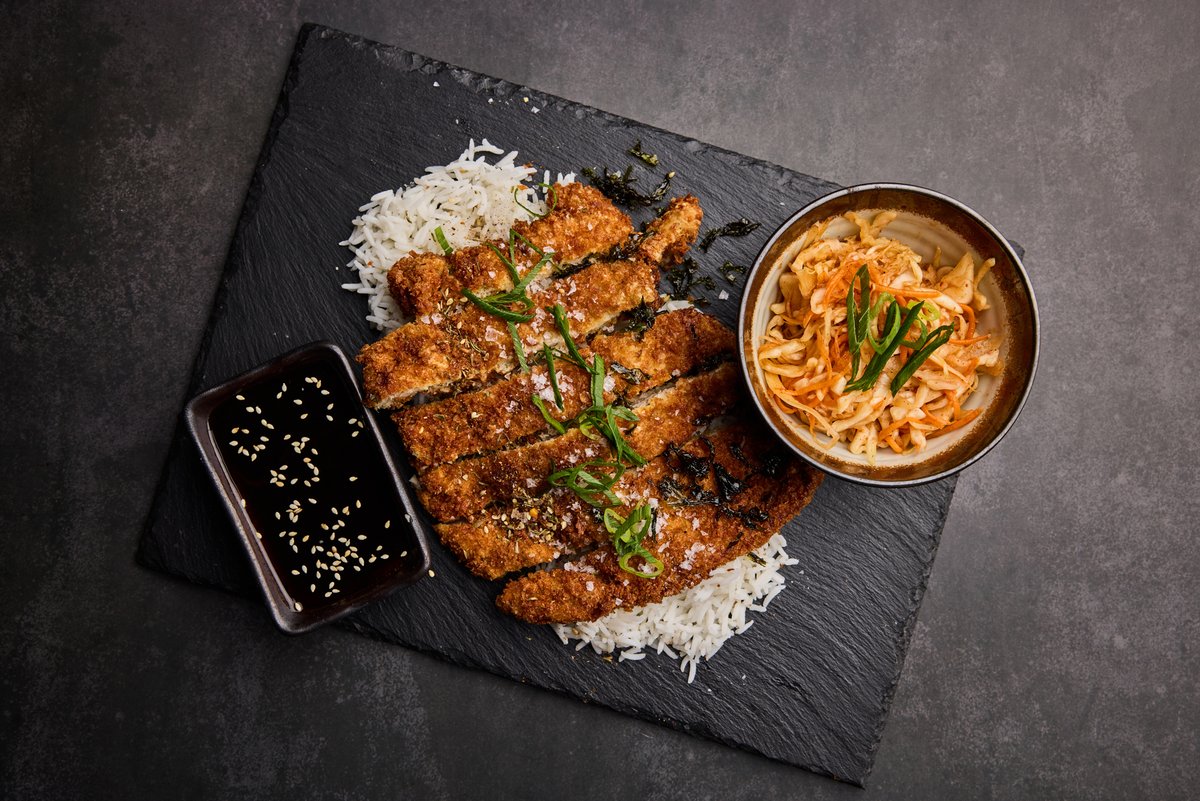 Panko džiūvėsėliuose kepta kiaulienos nugarinė, patiekiama su ryžiais ir azijietiškų kopūstų salotomis. Pagardinta tonkatsu padažu ir zatar prieskonais