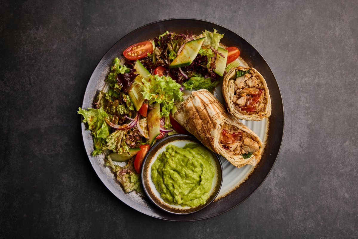 Meksikietiški paplotėliai su vištienos file, pomidorais, sūriu, aitriosiomis paprikomis, bazilikais, svogūnais, Teriyaki padažu, patiekiama su avokadų padažu
