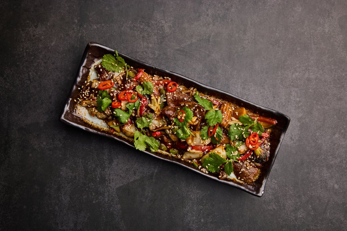 Kepti saldžių bulvių makaronai su antiena ir austrių, gochujang padažu, sojų daigais, muer grybais, morkomis, svogūnais ir bokchoy