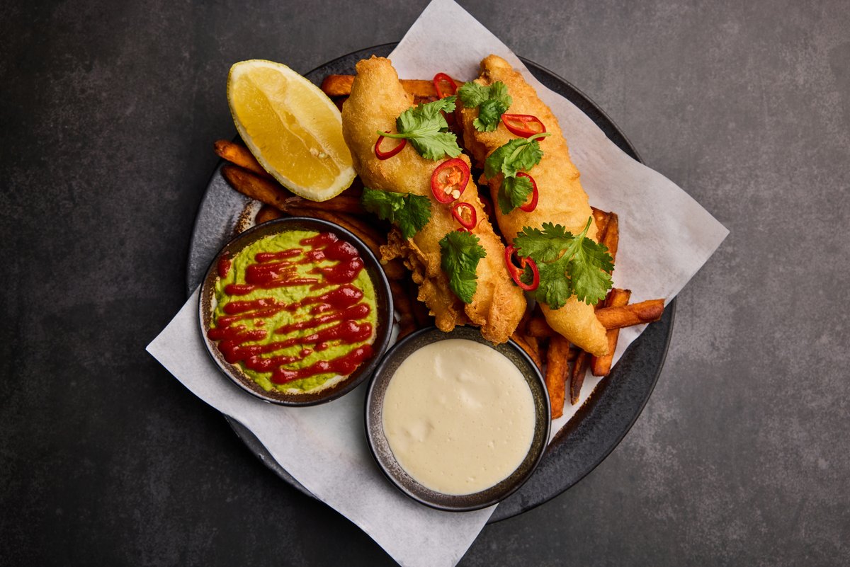 Gruzdinta menkė, gruzdintos saldžiųjų bulvių juostelės, žirnių košė, miso majonezas