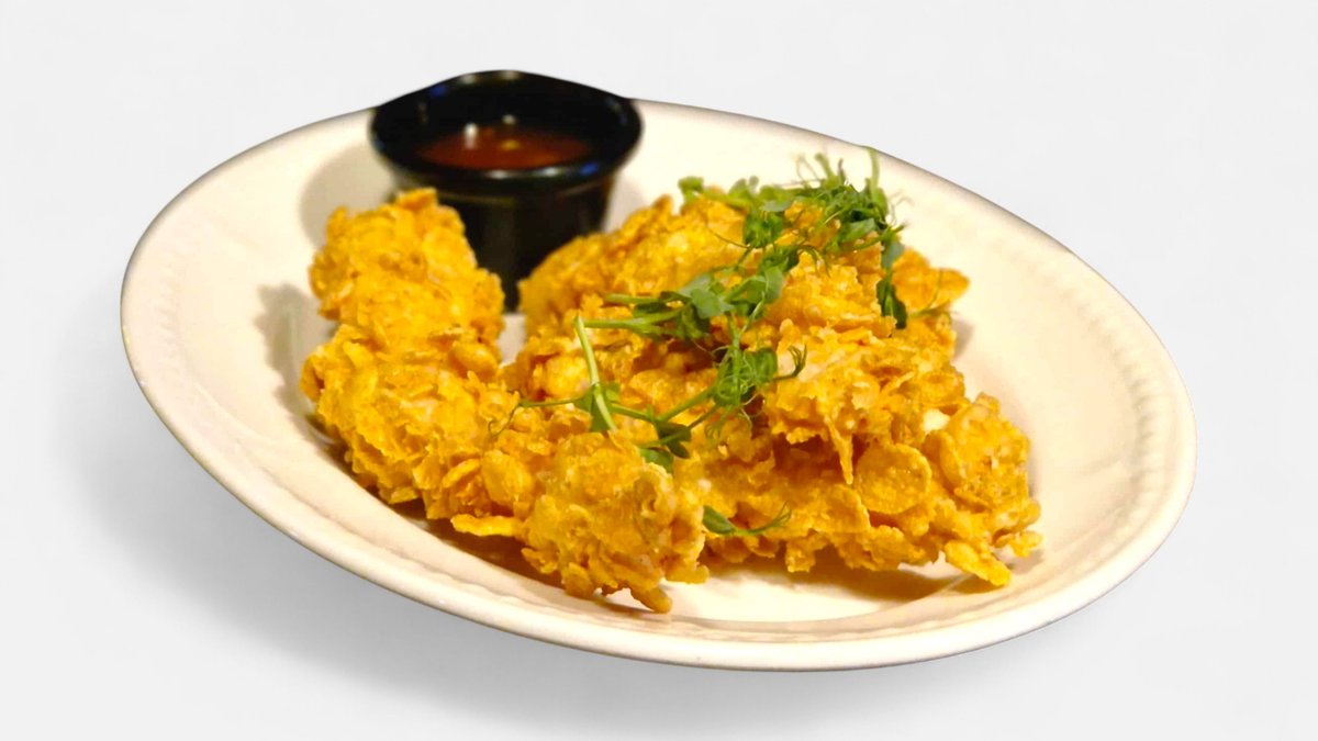 Traškios vištienos juostelės paniruotos tempuroje ir kukurūzų dribsniuose, patiekiama su Sweet Chilli padažu