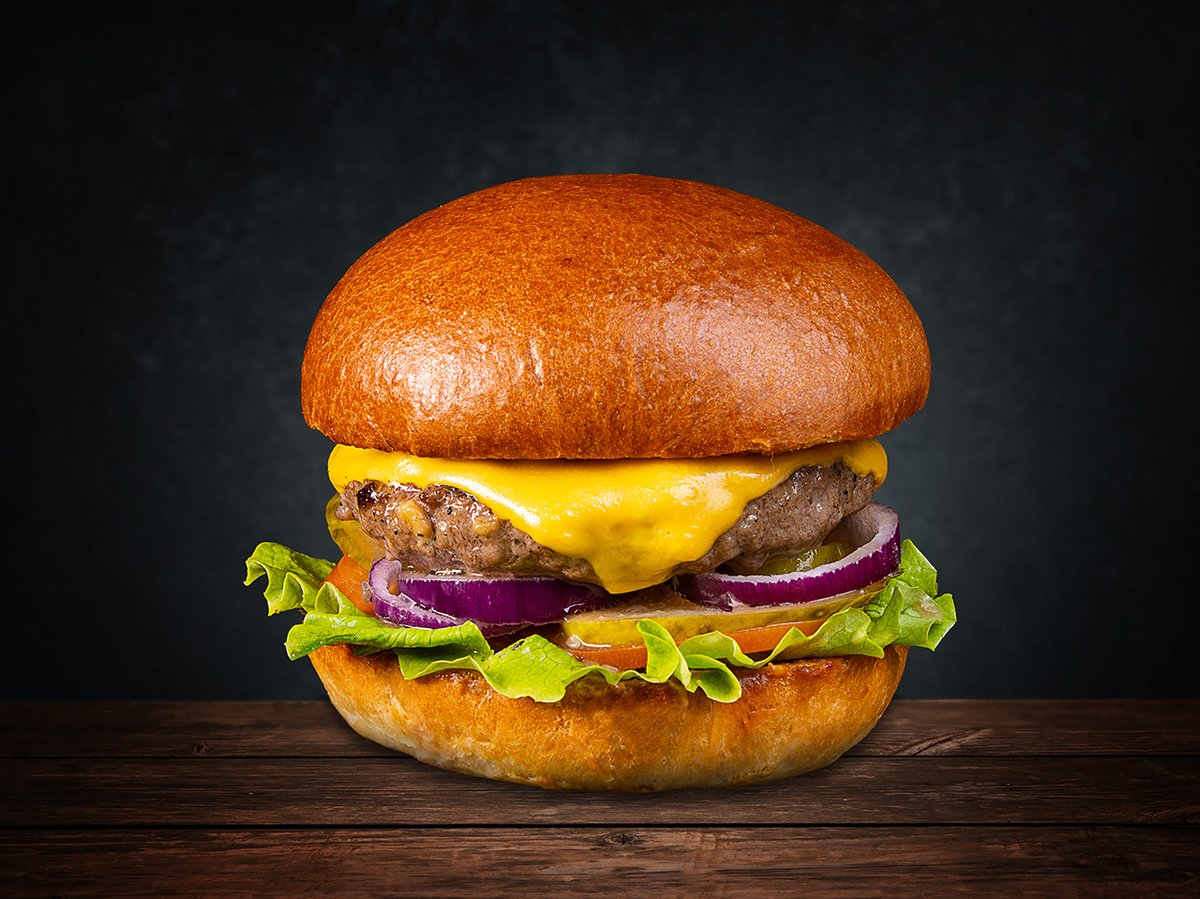 Sviestinė bandelė, burgerių padažas,BBQ padažas,pomidorai, jautienos paplotėlis, sūris, salotos, marinuotas agurkas.