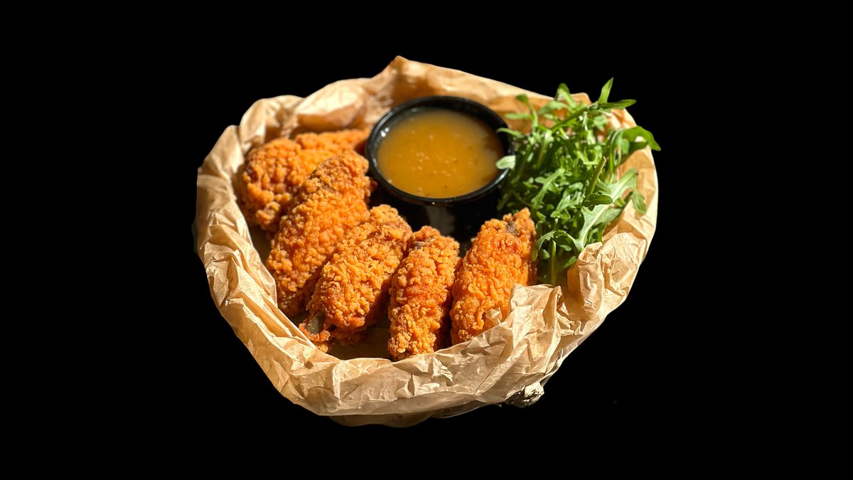 Sviestinė bandelė, salotos, du be lukšto virti kiaušiniai, česnakinis padažas, svogūnų traškučiai, karštai rūkyta šoninė, vyšniniai pomidoriukai