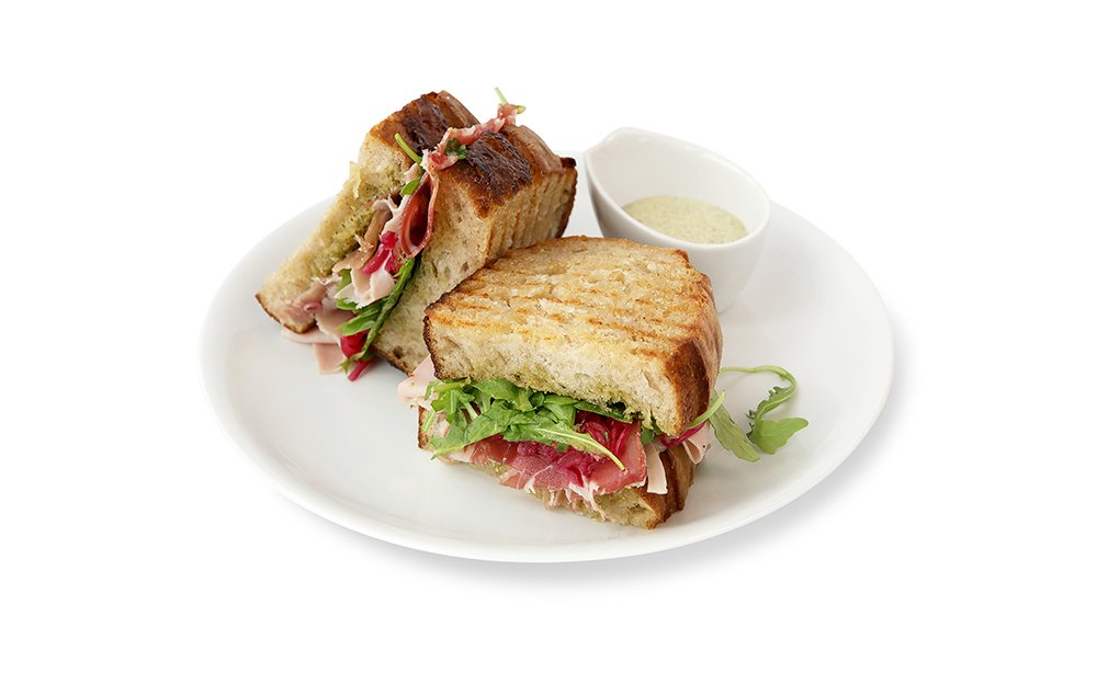 Sourdough duonos skrebutis su vytintų mėsų rinkiniu: Serrano, Prosciutto Cotto ir Coppa, pagardintas pesto padažu, marinuotais svogūnais ir šviežiomis gražgarstėmis