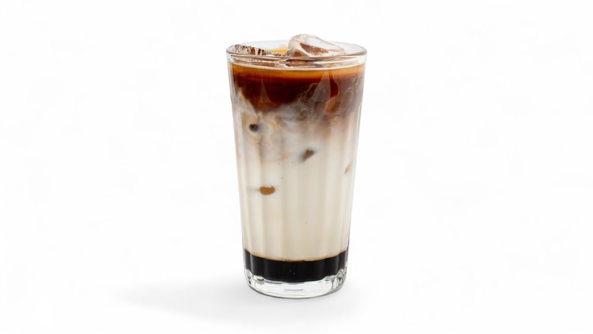 Intensyvaus juodojo šokolado ir lazdynų riešutų trigubo espresso kavos gėrimas su negrūstu ledu ir neplaktu pienu