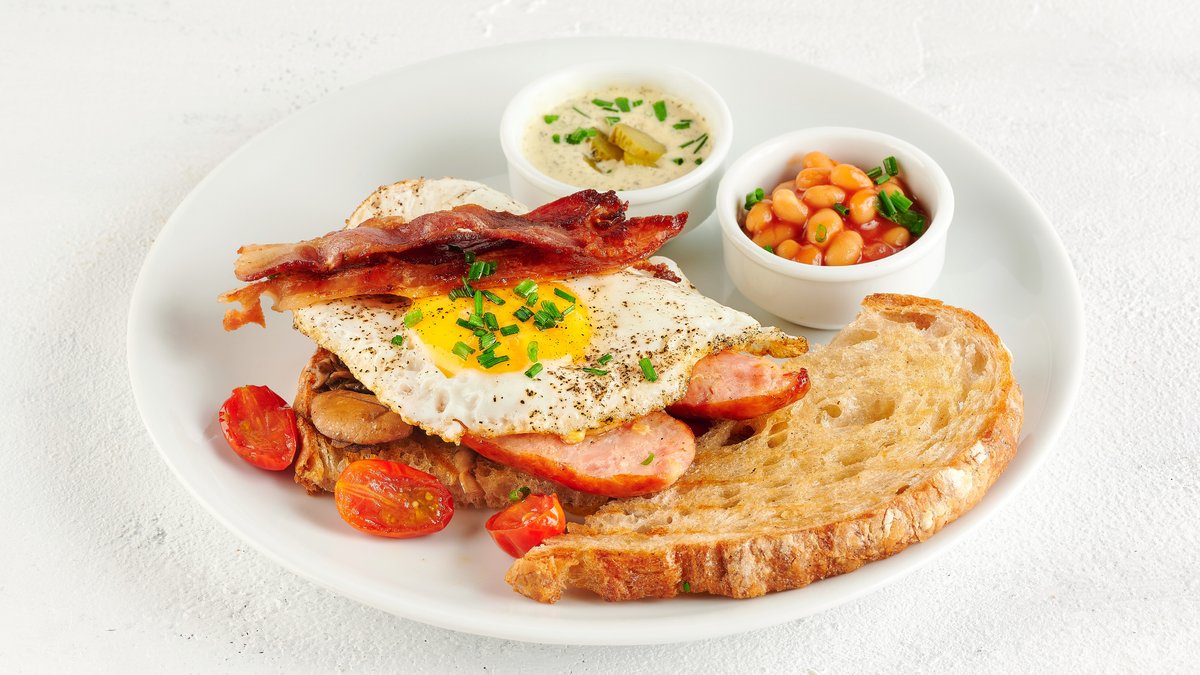 Keptas kiaušinis, kiaulienos dešrelė, gruzdinta šoninė, pievagrybiai, pupelės, Sourdough duona