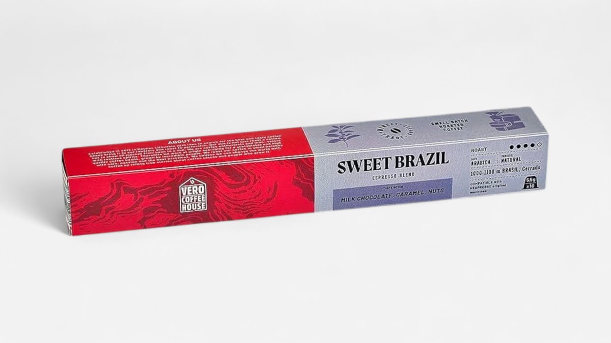 Kavos kapsulės - modernus būdas mėgautis aukščiausios kokybės kava! Populiariausia Vero Cafe kava Sweet Brasil - dabar ir kavos kapsulėse. Pamėgta kavinės svečių, itin mėgstama ir namuose. Tai mūsų klasikinė kava, kuri atkeliavo iš tolimosios Brazilijos. Puikus skonių balansas, kuriame susipina lazdyno riešutai bei medaus saldumas. Suderinamos su Nespresso tipo kavos aparatais: šios kapsulės tinka Nespresso tipo kavos aparatams ir kiekvieną kartą užtikrina sodrų ir kvapnų puodelį. Vietoje skrudinta ir supakuota: kiekviena kapsulė iki tobulumo paskrudinama ir supakuojama Lietuvoje, VERO COFFEE HOUSE kavos namuose, išsaugant šviežumą ir sodrius aromatus. Tiesiogiai gaunamos kavos pupelės: žalias kavos pupeles mūsų kavos namai gauna tiesiai iš patikimų kavos augintojų, todėl kiekvienoje kapsulėje užtikriname aukštos kokybės ir etiškai užaugintas pupeles. Pagaminta tvariai: mūsų kapsulės pagamintos iš iki 80% perdirbto aliuminio. Panaudotas kapsules galima lengvai perdirbti ir rūšiuoti, taip mažinant atliekų kiekį. Patogi 10 vienetų pakuotė: kiekvienoje kapsulėje yra 5,5 g profesionaliai skrudintos kavos, o kiekvienoje pakuotėje yra 10 kapsulių. Skonyje dominuoja Lazdynų riešutai, juodasis šokoladas Aromatas Saldus, lazdynų riešutų Kilmės šalis Brazilija Kavos porūšis 100% Arabika Skrudinimas Vidutinis