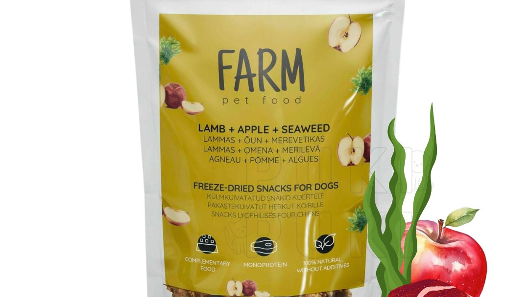 6,25 €FARM liofilizuoti skanėstai – ėriena su obuoliu ir jūros dumbliais, 80 g