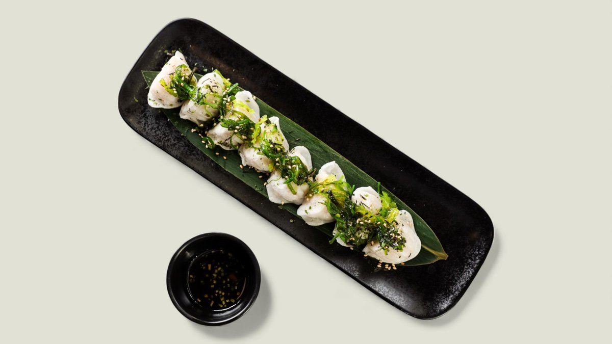 7 vnt. garintų ryžių miltų koldūnų su krevetėmis, wakame, sezamai, soja