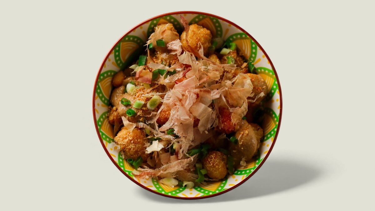 5 vnt. tešlos rutuliukų su aštuonkoju, majonezas, teriyaki, svogūnų laiškai, vytinto tuno drožlės