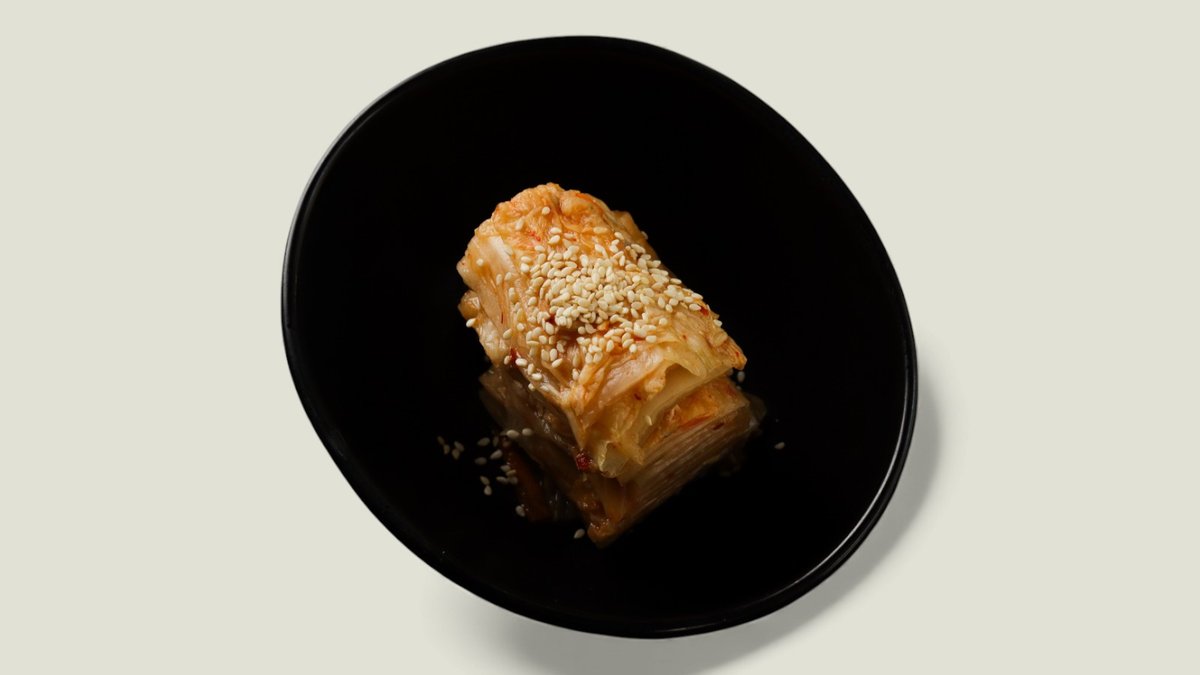 Plėšyta kiauliena, sezamų majonezas, svogūnai, kimchi, sezamai, kalendra