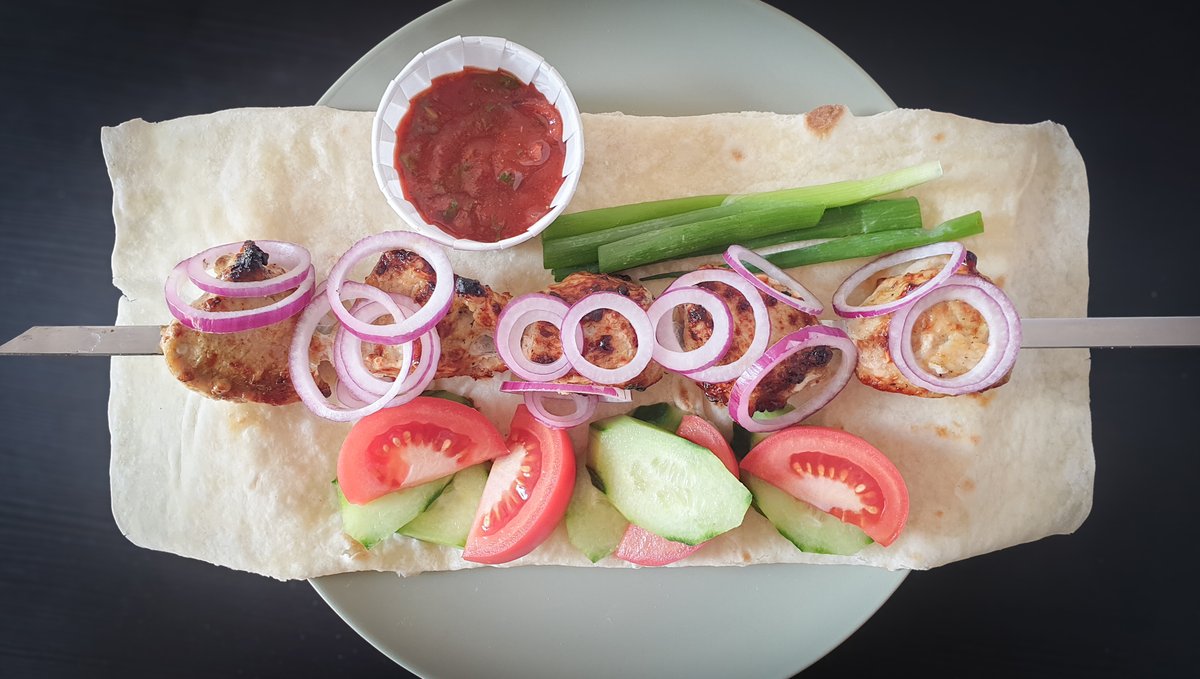 Vištienos šašlykas, keptas ant žarijų. Patiekiamas su svogūnais, agurkais, pomidorais, duona/lavašu ir pasirinktu padažu