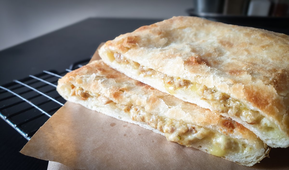 Sluoksniuotos tešlos pyragėlis su mėsa, grybais ir sūriu