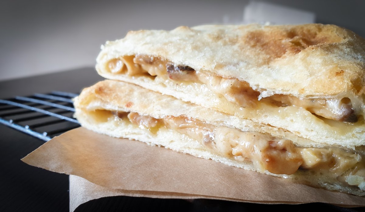 Sluoksniuotos tešlos pyragėlis su grybais ir sūriu